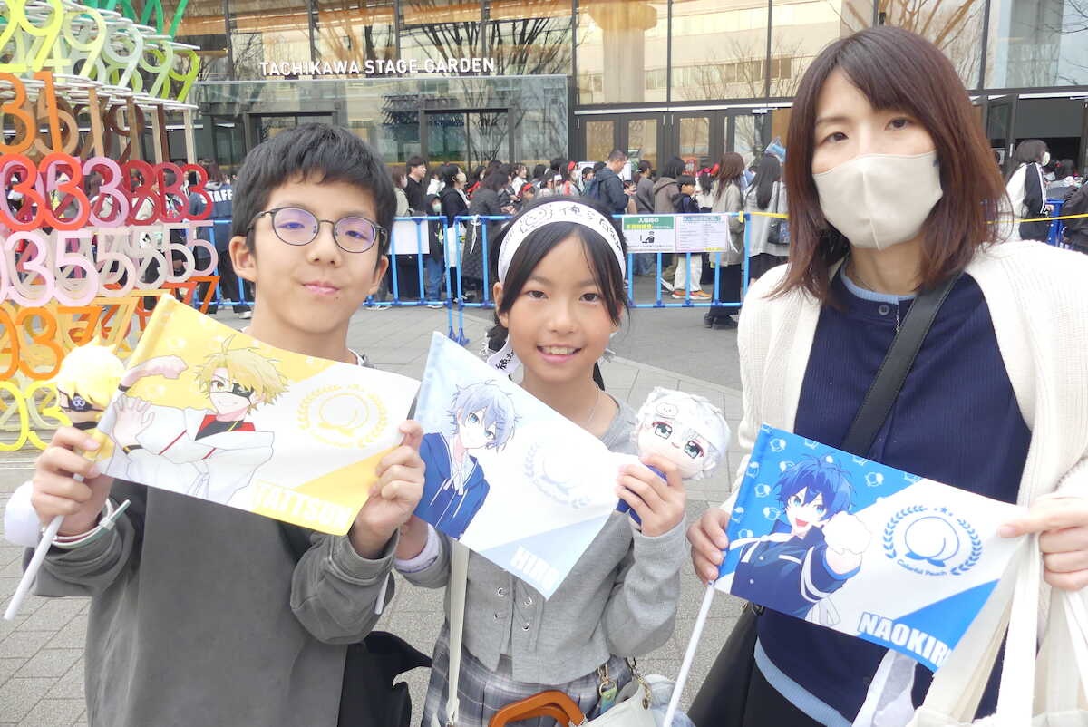 この春から中1のはるきさんは、母綾子さんと、妹しほさん(小4)と来場。たっつんのファンで「フラッグとぬいぐるみを見せたら、指さししてくれた!」と興奮。目と目が合う距離でかなえた推しとの交流に「楽しかった。大満足!!」と目を輝かせた。ちなみに綾子さんはなおきりファン、妹はヒロのファンという。