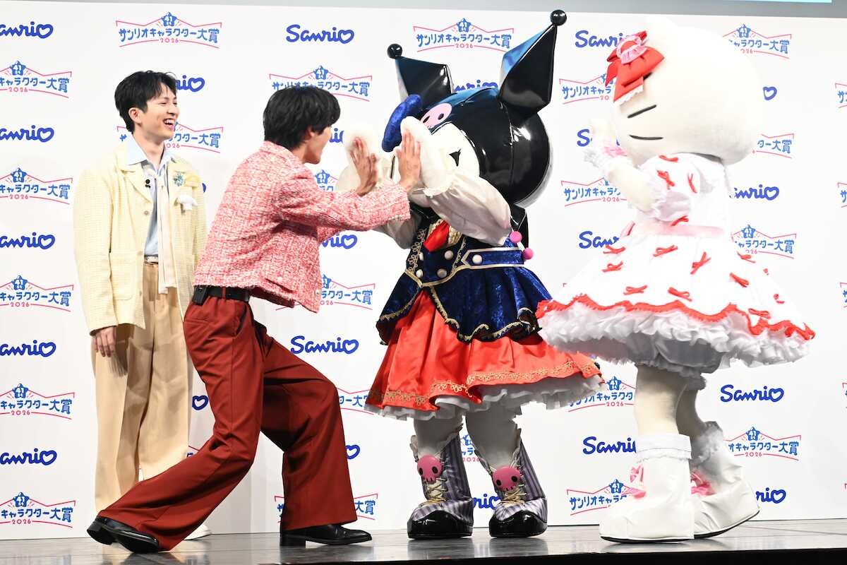 「2026年サンリオキャラクター大賞」開幕イベントで推しキャラのクロミとハイタッチする曽野舜太と見守る吉田仁人、ハローキティ(撮影・糸賀日向子)