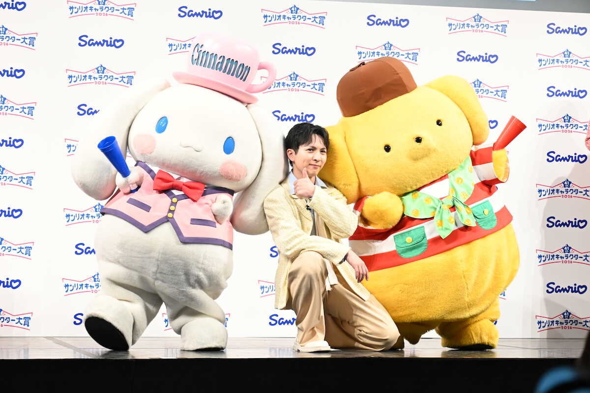 「2026年サンリオキャラクター大賞」開幕イベントでシナモロールとポムポムプリンと「イイじゃん」のポーズをする吉田仁人(撮影・糸賀日向子)