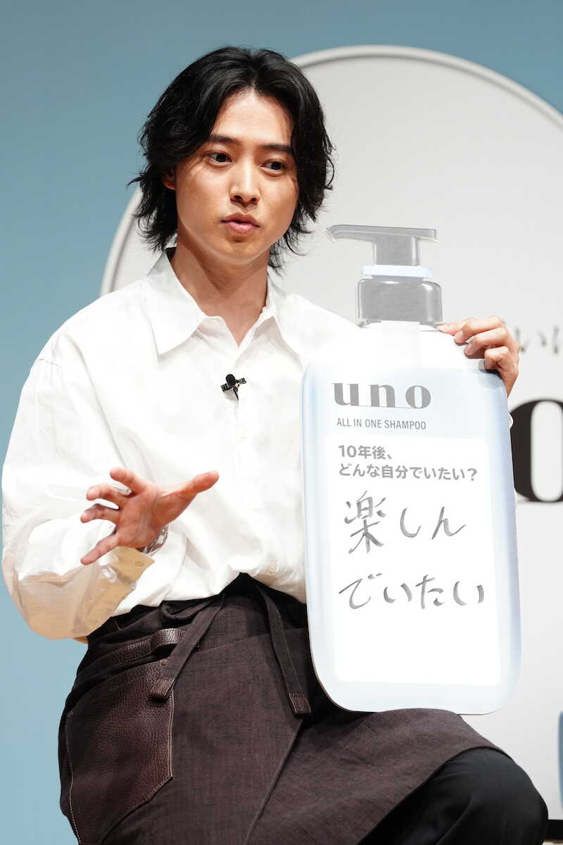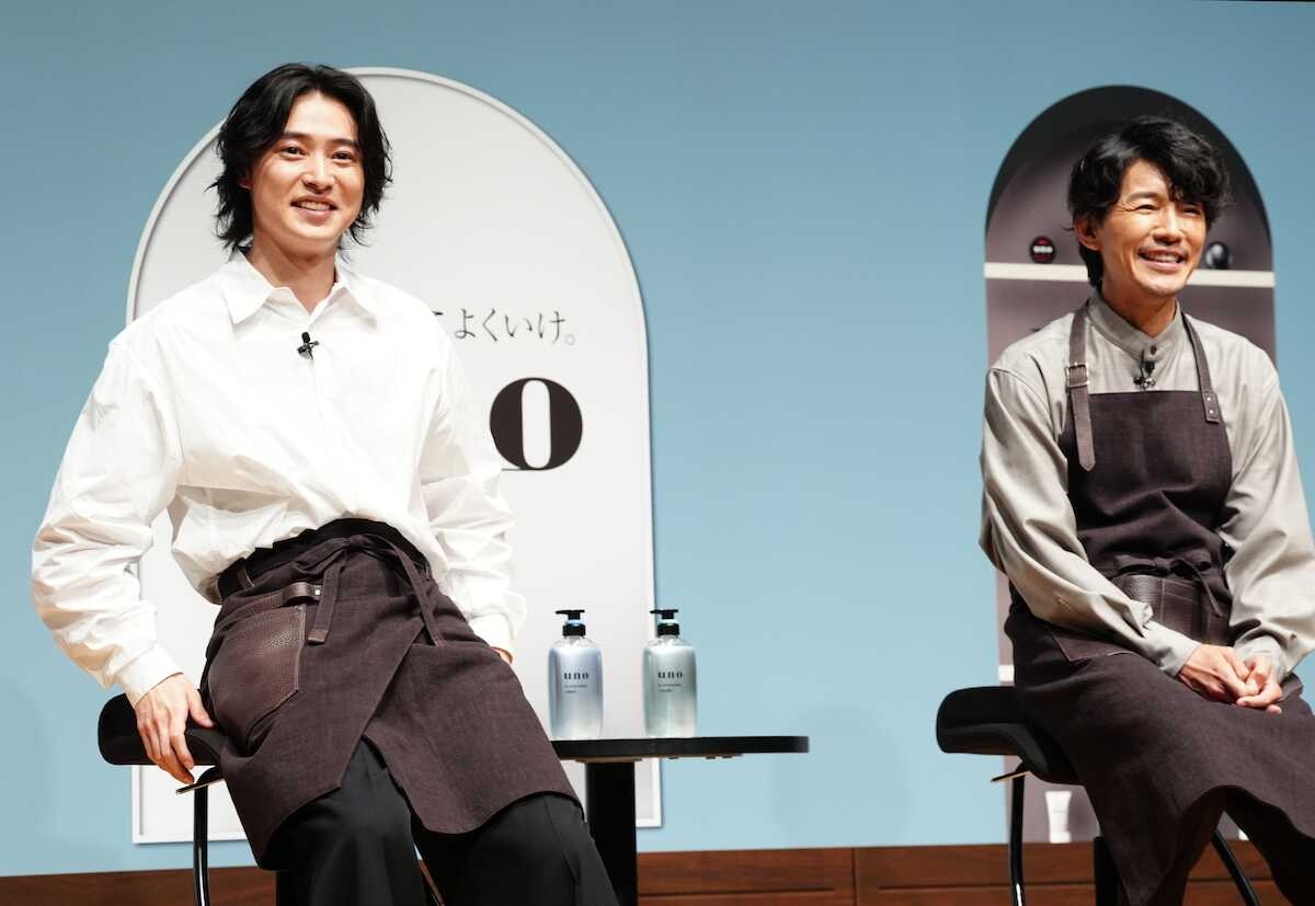 俳優の山崎賢人と藤木直人が13日、都内でファイントゥデイ「uno(ウーノ)」ヘアケア新CM発表会に出席した。9日に2028年のNHK大河ドラマ「ジョン万」で主演することが発表された山崎を藤木が祝った。