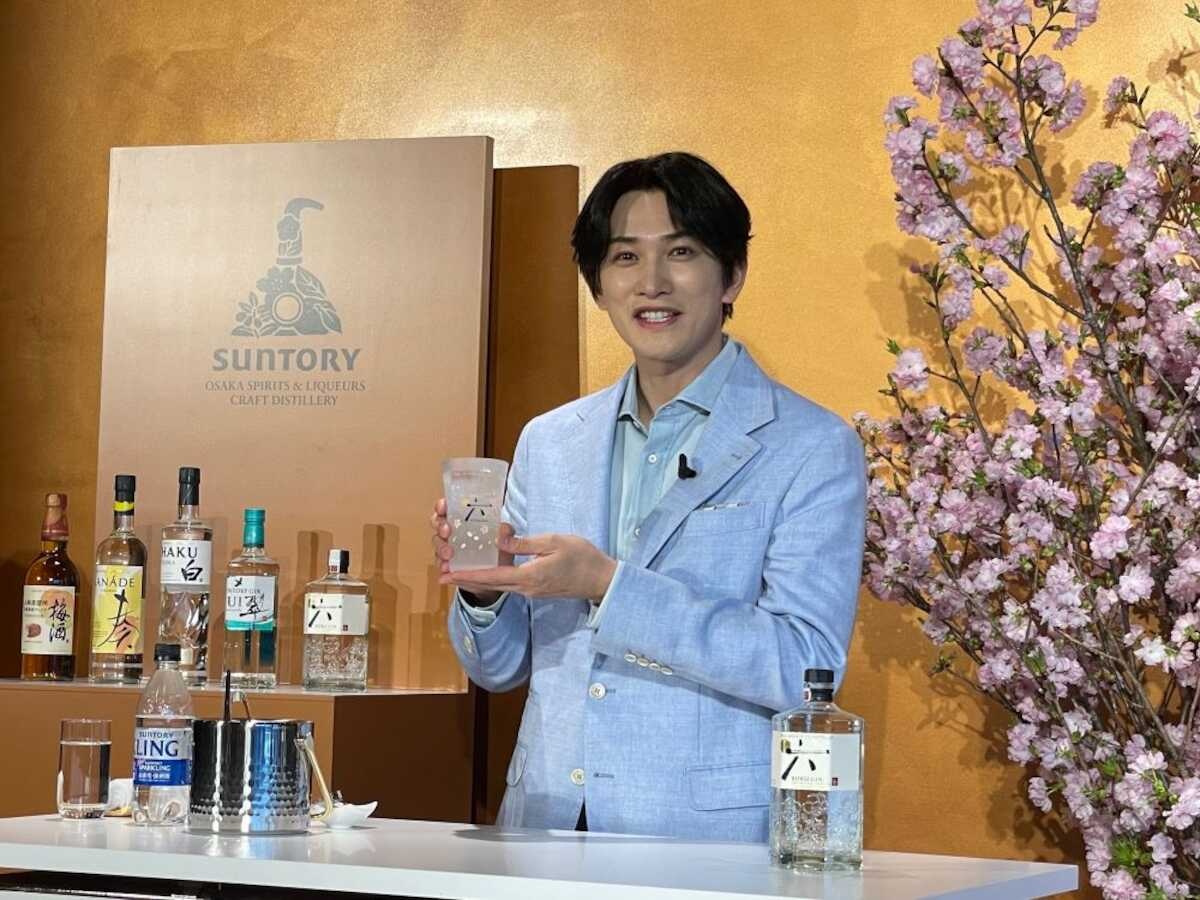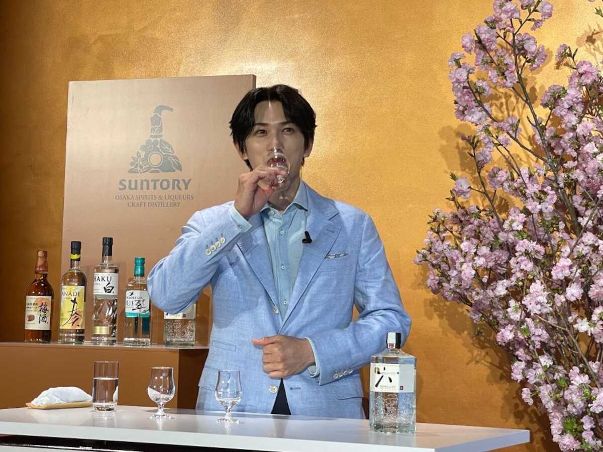桜葉、ゆず、山椒、玉露など6種類の“和“の素材をブレンドしたジャパニーズジン。会見で実際にテイスティングしてみせ、「玉露はほっこりしますね」「山椒は香りが立ってる」と感想。「旬の素材を閉じ込めてる。自然の素材を大切にしてるのが分かります」と感心していた。