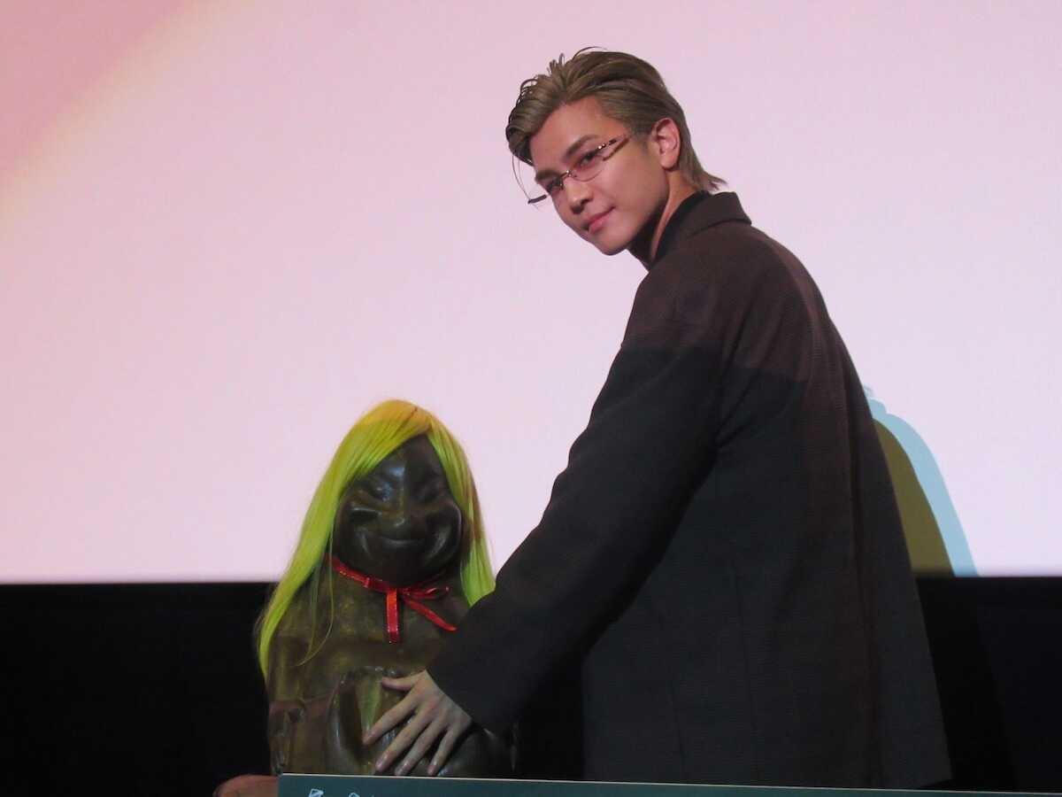 映画「金髪」の先行上映会で舞台あいさつした三代目 J SOUL BROTHERS・岩田剛典はビリケンさんが登場して満面に笑み