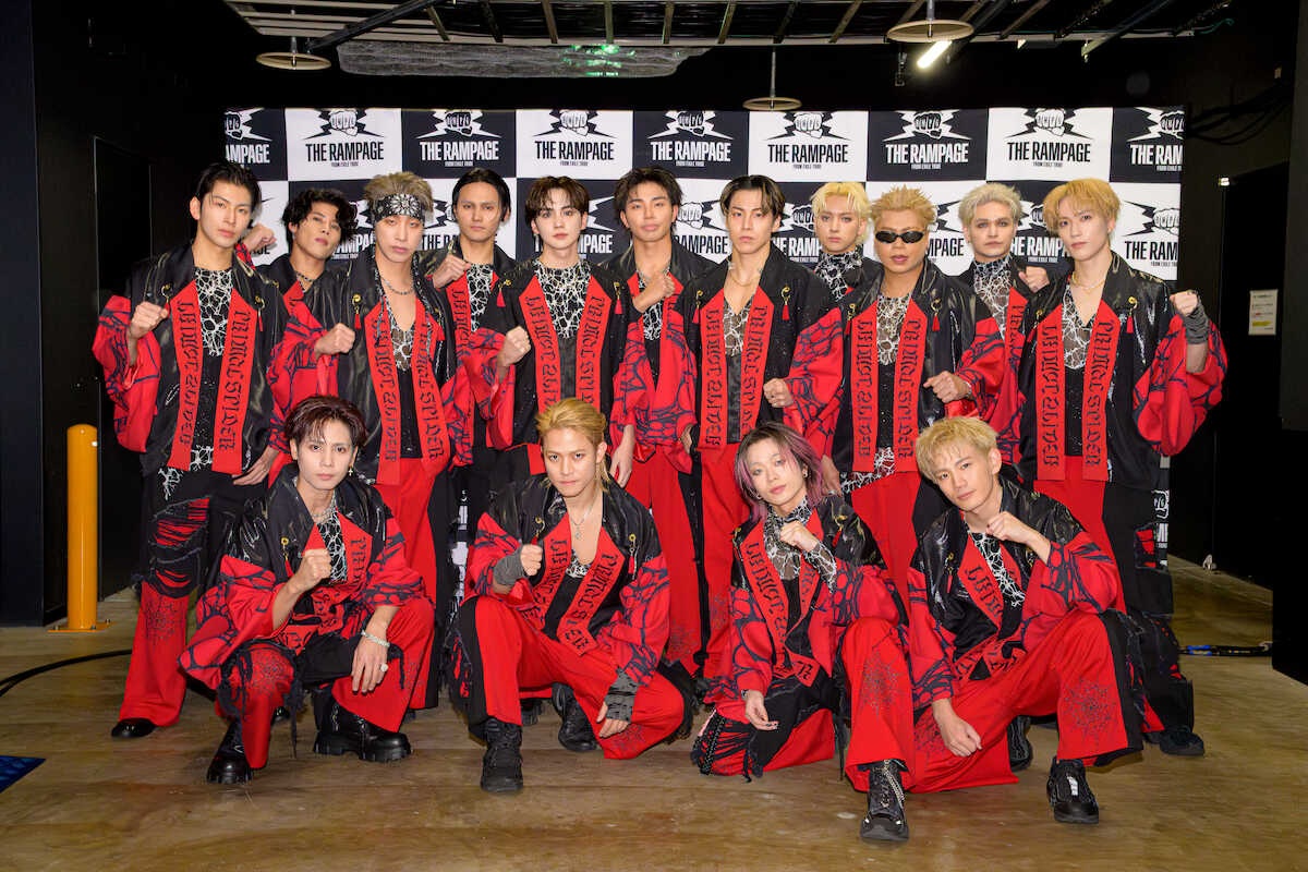 ツアーの最終公演を行った「THE RAMPAGE」の(1列目左から)岩谷翔吾、与那嶺瑠唯、神谷健太、浦川翔平(2列目左から)藤原樹、鈴木昂秀、長谷川慎、後藤拓磨(3列目左から)山本彰吾、RIKU、陣、武知海青、LIKIYA、吉野北人、龍