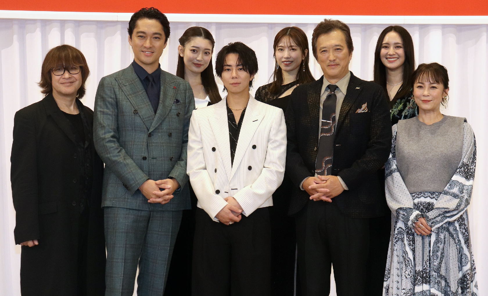 舞台「醉いどれ天使」の製作発表に出席した(前列左から)演出の深作健太氏、渡辺大、北山宏光、大鶴義丹、佐藤仁美(後列同)阪口珠美、横山由依、岡田結実