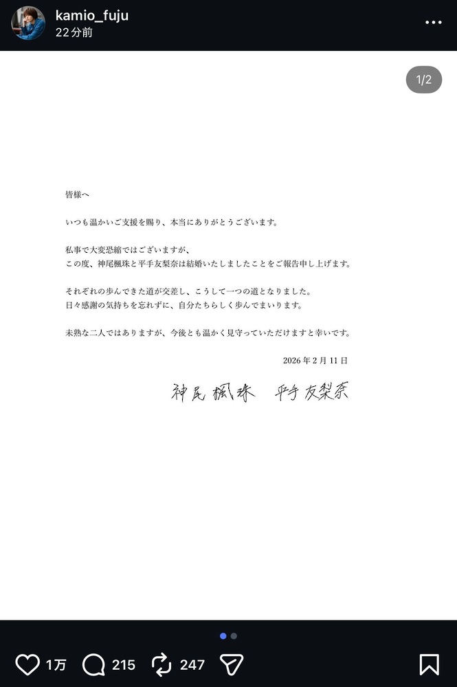 2人は双方のSNSに直筆署名入りの文書を掲載。「皆様へ いつも温かいご支援を賜り、本当にありがとうございます。私事で大変恐縮ではございますが、この度、神尾楓珠と平手友梨奈は結婚いたしましたことをご報告申し上げます」と発表した。