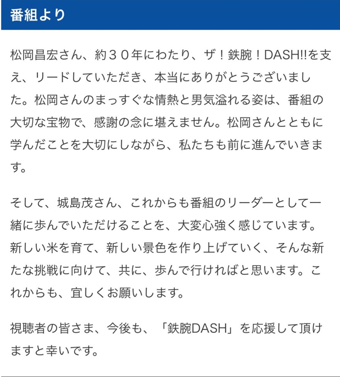 公式Xでは、長年番組を牽引してきた松岡に対し「約30年にわたり、ザ!鉄腕!DASH!!を支え、リードしていただき、本当にありがとうございました」と感謝。その功績を「まっすぐな情熱と男気溢れる姿は、番組の大切な宝物」と称え「松岡さんとともに学んだことを大切にしながら、私たちも前に進んでいきます」と決意を綴った。