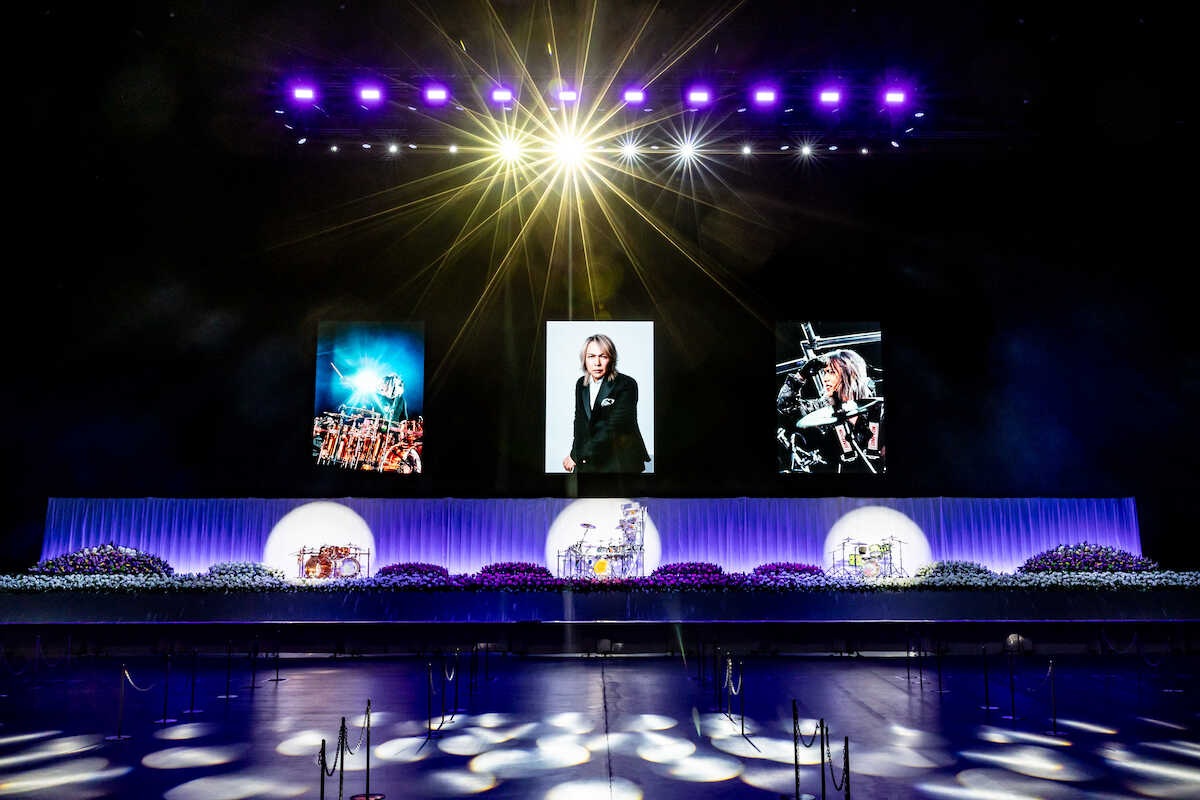 会場はセンターに真矢さんの大きな遺影、向かって左には最後のステージとなった昨年の東京ドーム公演、そして右には1996年横浜スタジアムで行われた「真冬の野外」で披露した360度回転ドラムでのステージパフォーマンスの肖像が飾られた。前方の横31メートルに渡る大きな祭壇には、昨年行われた東京ドーム公演で使用された3台のドラムセットが並んだ。