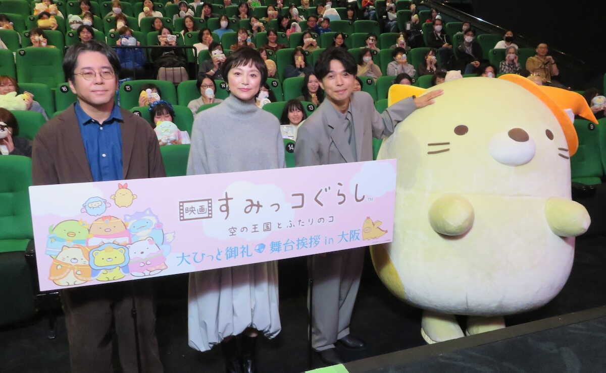 大阪市内でアニメ映画「すみっコぐらし 空の王国とふたりのコ」の大ヒット御礼舞台あいさつにに出席した(右から)井ノ原快彦、本上まなみ、角田貴志(撮影・窪田 信)