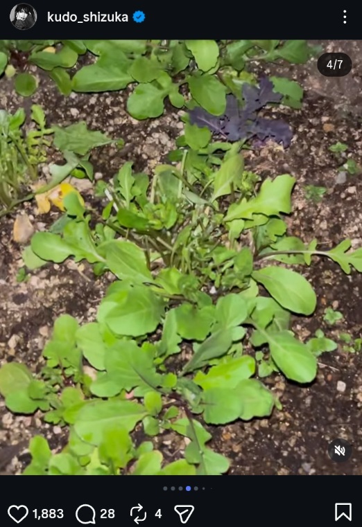 「季節外れに撒いたにもかかわらず、雪にも負けず頑張って大きくなったルッコラ!大切にしていたらしっかり収穫して食べれます!」、「私にとっては、どんな高級食材よりも贅沢を味わえる瞬間です」などと、自家栽培の食材や、調理したカルパッチョ、サラダなどが並ぶ食卓の写真をアップ。