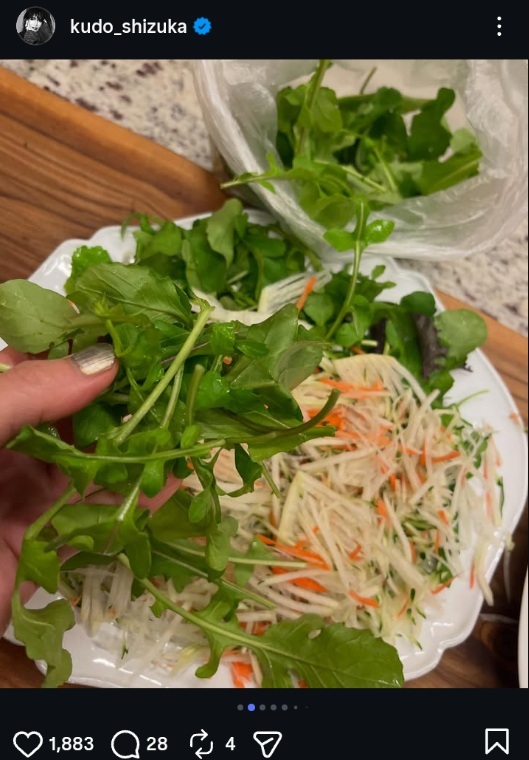 木村拓哉の妻で歌手の工藤静香が9日までに自身のインスタグラムを更新。ルッコラや金柑など“自家栽培”食材を使ったディナーを公開した。