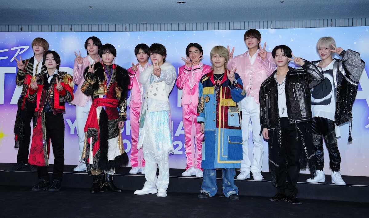 <ジュニア STAR to FESTIVAL 2026>フォトセッションに臨む(前列左から)西村拓哉、KEY TO LIT・井上瑞稀、ACEes・浮所飛貴、B&ZAI・矢花黎、黒田光輝、(後列同)AmBitious・永岡蓮王、阿達慶、宮岡大愛、山岸想、千井野空翔、元木湧(撮影・大城 有生希)