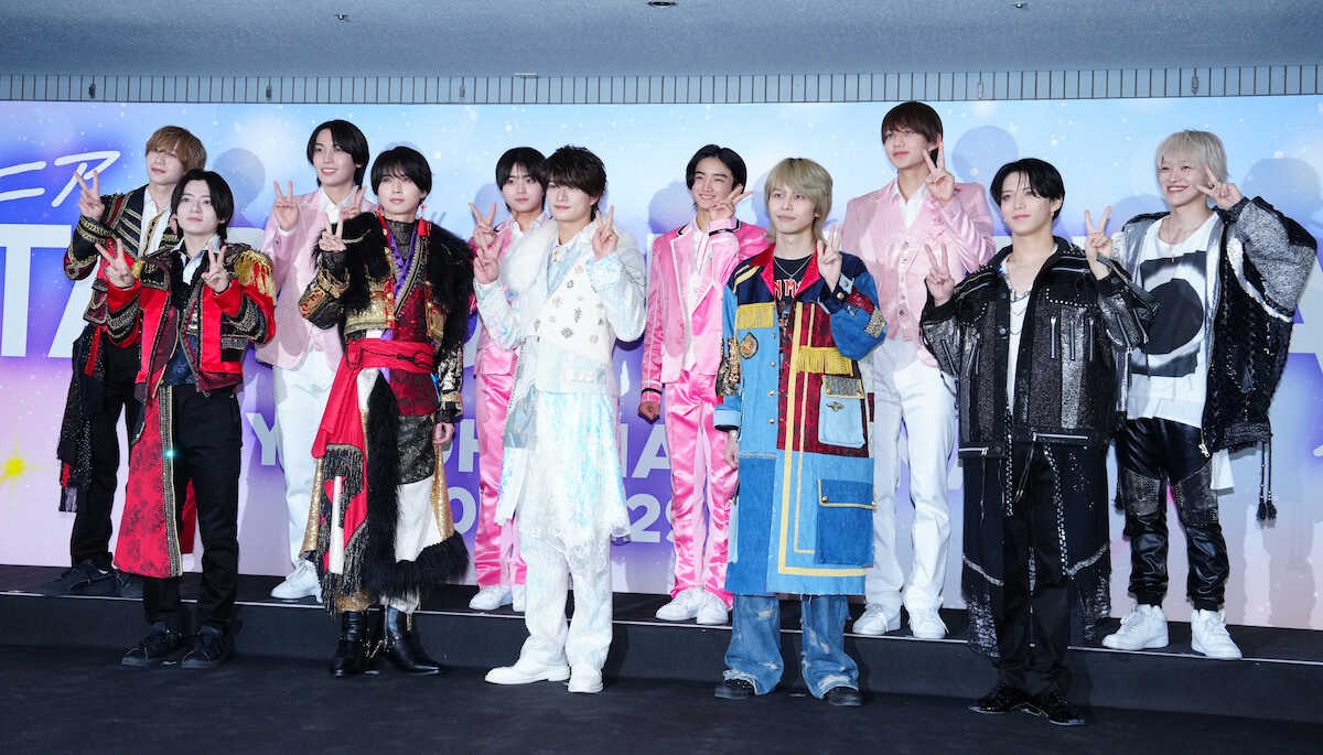 <ジュニア STAR to FESTIVAL 2026>フォトセッションに臨む(前列左から)西村拓哉、KEY TO LIT・井上瑞稀、ACEes・浮所飛貴、B&ZAI・矢花黎、黒田光輝、(後列同)AmBitious・永岡蓮王、阿達慶、宮岡大愛、山岸想、千井野空翔、元木湧(撮影・大城 有生希)