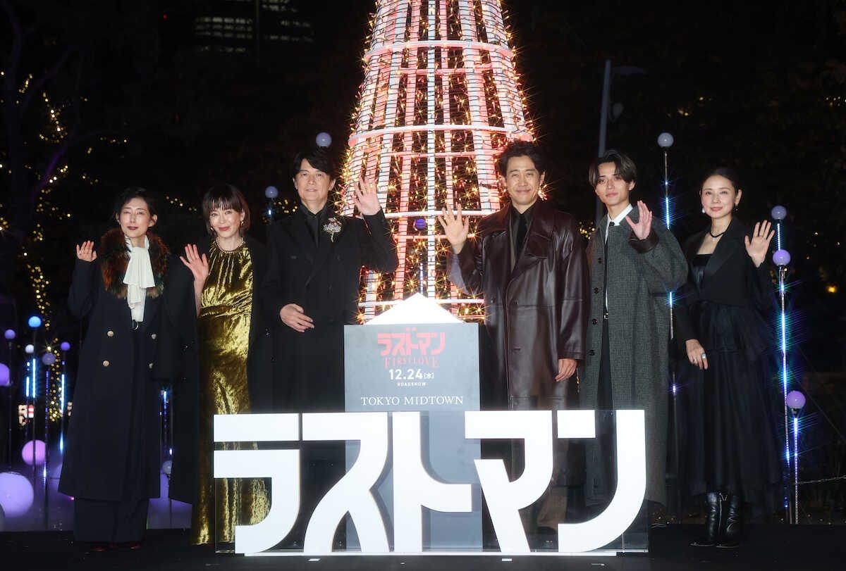 <映画「ラストマン」プレミアム点灯式>出席した(左から)木村多江、宮沢りえ、福山雅治、大泉洋、永瀬廉、吉田羊 (撮影・須田 麻祐子)