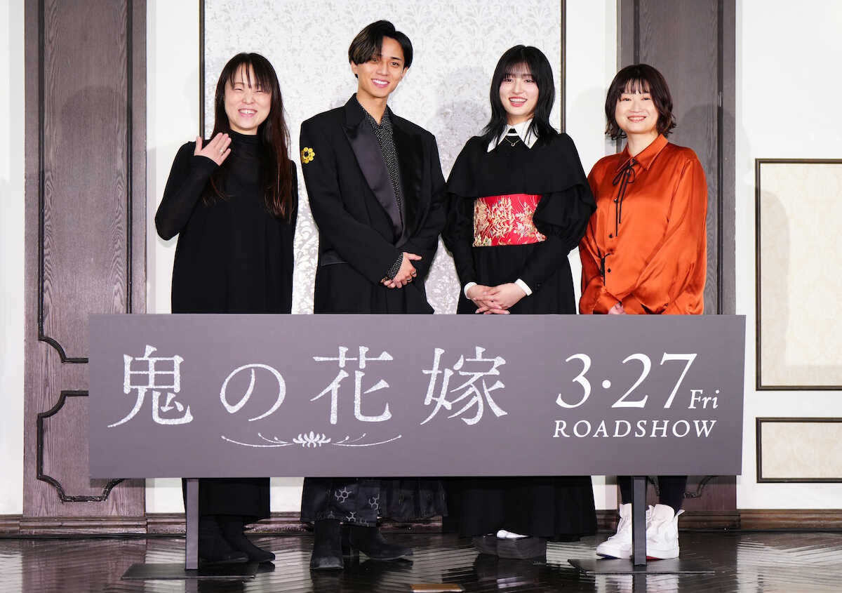 <「鬼の花嫁」製作報告会>フォトセッションに臨む(左から)西麻美プロデューサー、永瀬廉、吉川愛、池田千尋監督(撮影・大城 有生希)