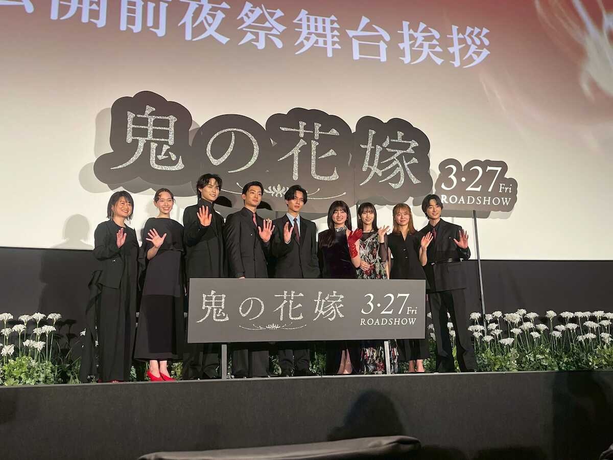 <映画「鬼の花嫁」公開前夜舞台あいさつ>舞台あいさつした(左から)池田千尋監督、白本彩奈、兵頭功海、伊藤健太郎、永瀬廉、吉川愛、片岡凜、田辺桃子、谷原七音(撮影・塩野 遥寿)