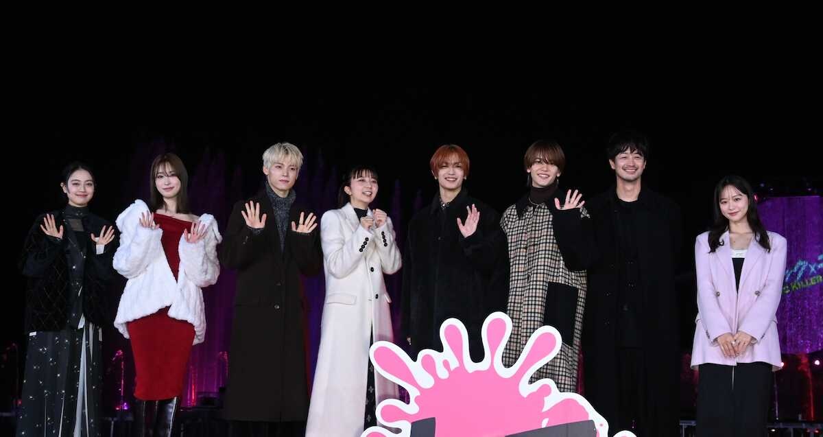 映画「ロマンティック・キラー」のロマンティックイルミネーション消灯式に出席した(左から)上坂樹里、髙橋ひかる、木村柾哉、上白石萌歌、高橋恭平、中島颯太、竹財輝之助、森香澄(撮影・糸賀日向子)