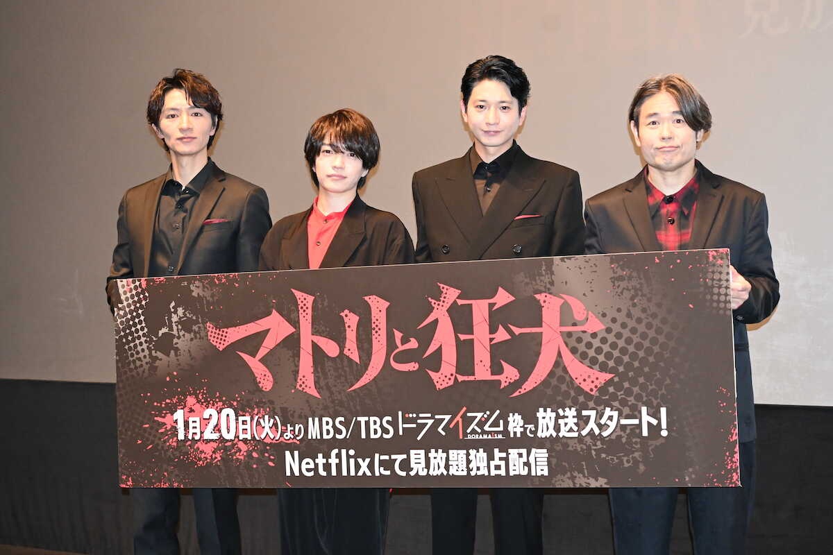 TBS系ドラマ「マトリと狂犬」トークイベントに出席した(左から)細田善彦、なにわ男子の西畑大吾、向井理、品川ヒロシ(撮影・糸賀日向子)