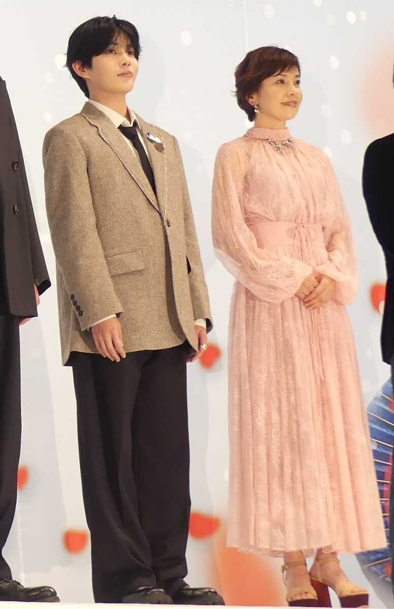 “母”の沢口靖子と完成披露試写会に出席した長尾謙杜(左)