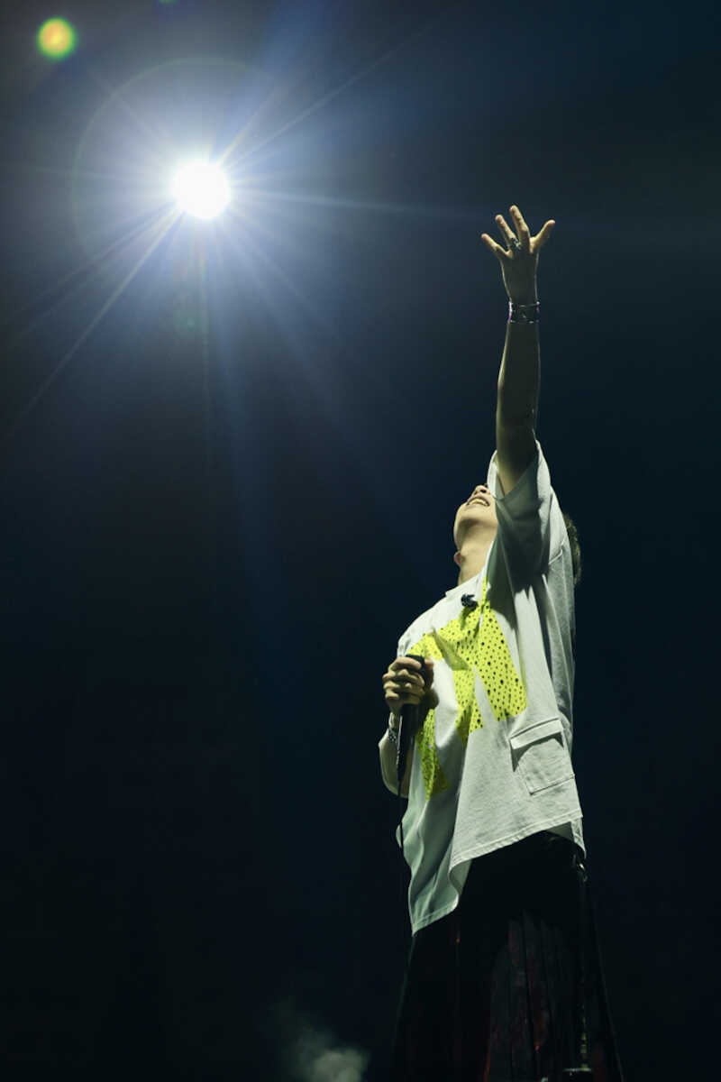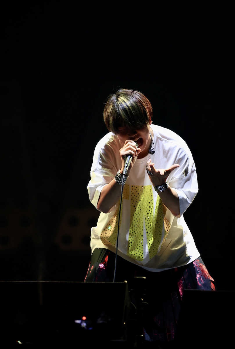 全編をプロデュース。マイク一本で戦う意志を示す、円形に並んだ約20本のスタンドマイクに囲まれながら、ソロ曲「喜怒哀楽」の力強いアカペラ歌唱で幕開け。「全身全霊で歌を届けます。一人でどんな作品がつくれるのか。挑戦します」と話した通り、トークパートなしで多様なジャンルの全21曲で魅了した。
