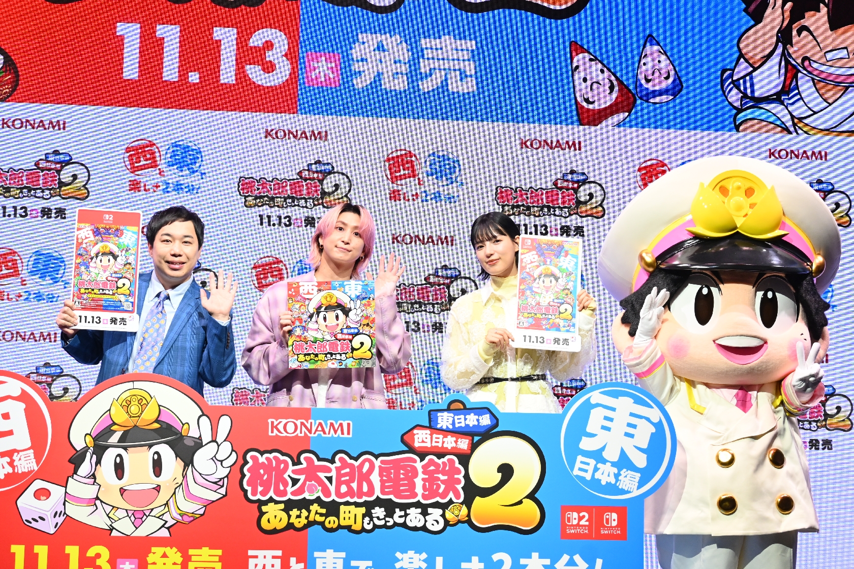 「桃太郎電鉄2 ~あなたの町も きっとある~」発売記念&新CM発表会に出席した(左から)せいや、Snow Man佐久間大介、石井杏奈(撮影・糸賀日向子)