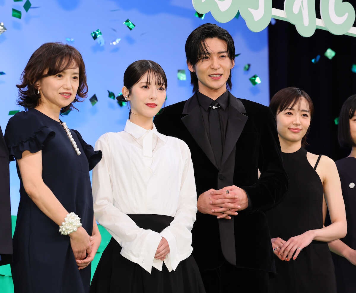 <映画「ほどなく、お別れです」完成披露舞台あいさつ>笑顔を見せる(左から)永作博美、浜辺美波、目黒蓮、森田望智