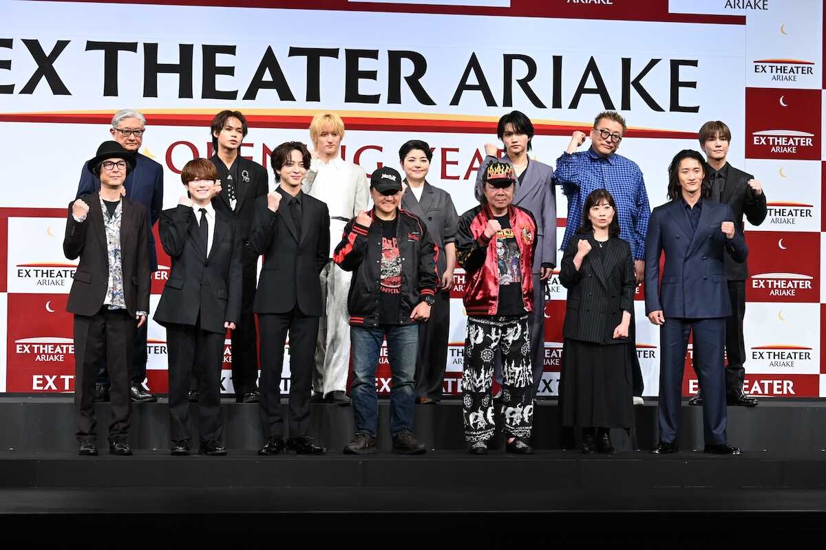 EXシアター有明オープニングラインナップ発表会に出席した(前列左から)河原雅彦氏、大橋和也、寺西拓人、いのうえひでのり氏、古田新太、小山ゆうな氏、岩本照、(後列同)堤幸彦氏、上田竜也、川島如恵留、小林香氏、三浦宏規、福田雄一氏、岩田剛典(撮影・糸賀日向子)