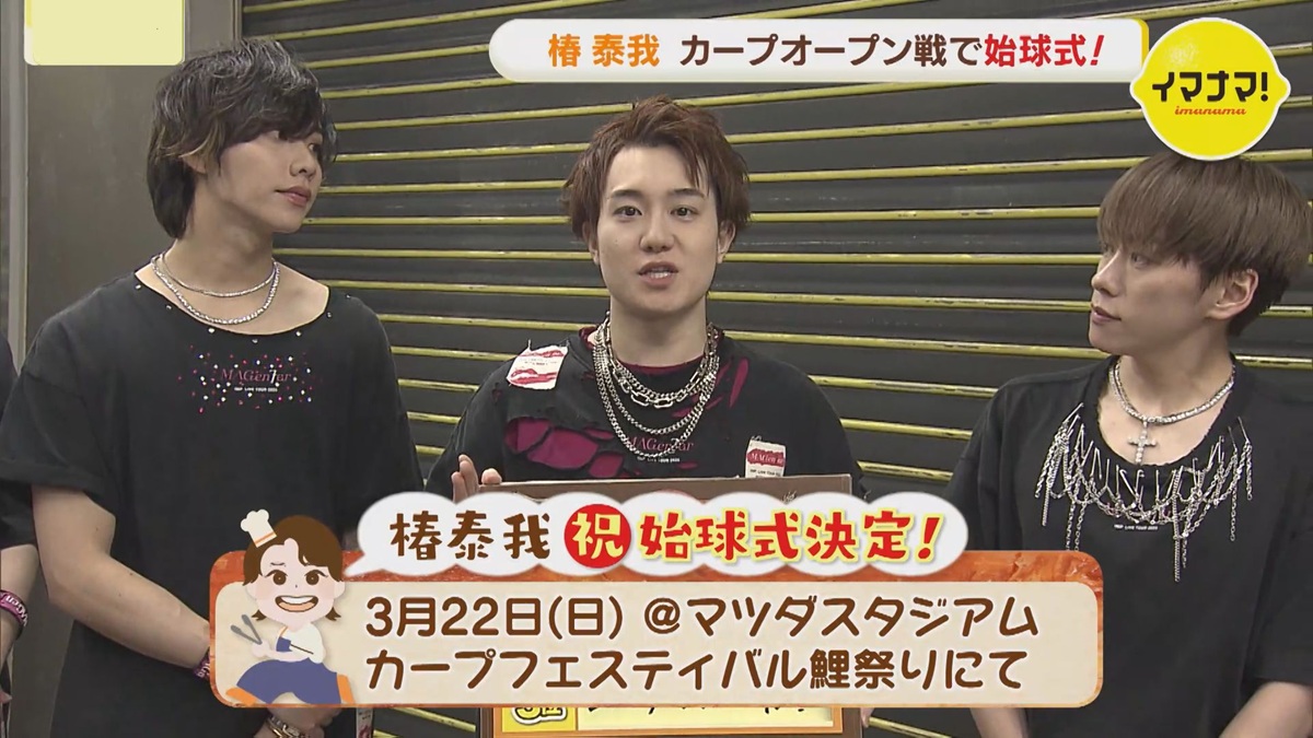 メンバー7人が集結する中、番組からファン待望の「重大発表」が行われた。なんと、3月22日にマツダスタジアムで行われるプロ野球オープン戦、広島戦で、椿が始球式を務めることが決定。これに対し、野球経験者であるメンバーの横原悠毅からは、コーナー内でパンを掴む「トング」を相棒にしている椿に対し「気をつけた方がいいのはボールをトングで掴まない方がいい」とアドバイスが送られ笑いに包まれた。大役を射止めた椿は「貴重なチャンスをいただきましたので、しっかりと届くように練習をして盛り上げられるように頑張らせていただきます」と力強く意気込みを語った。