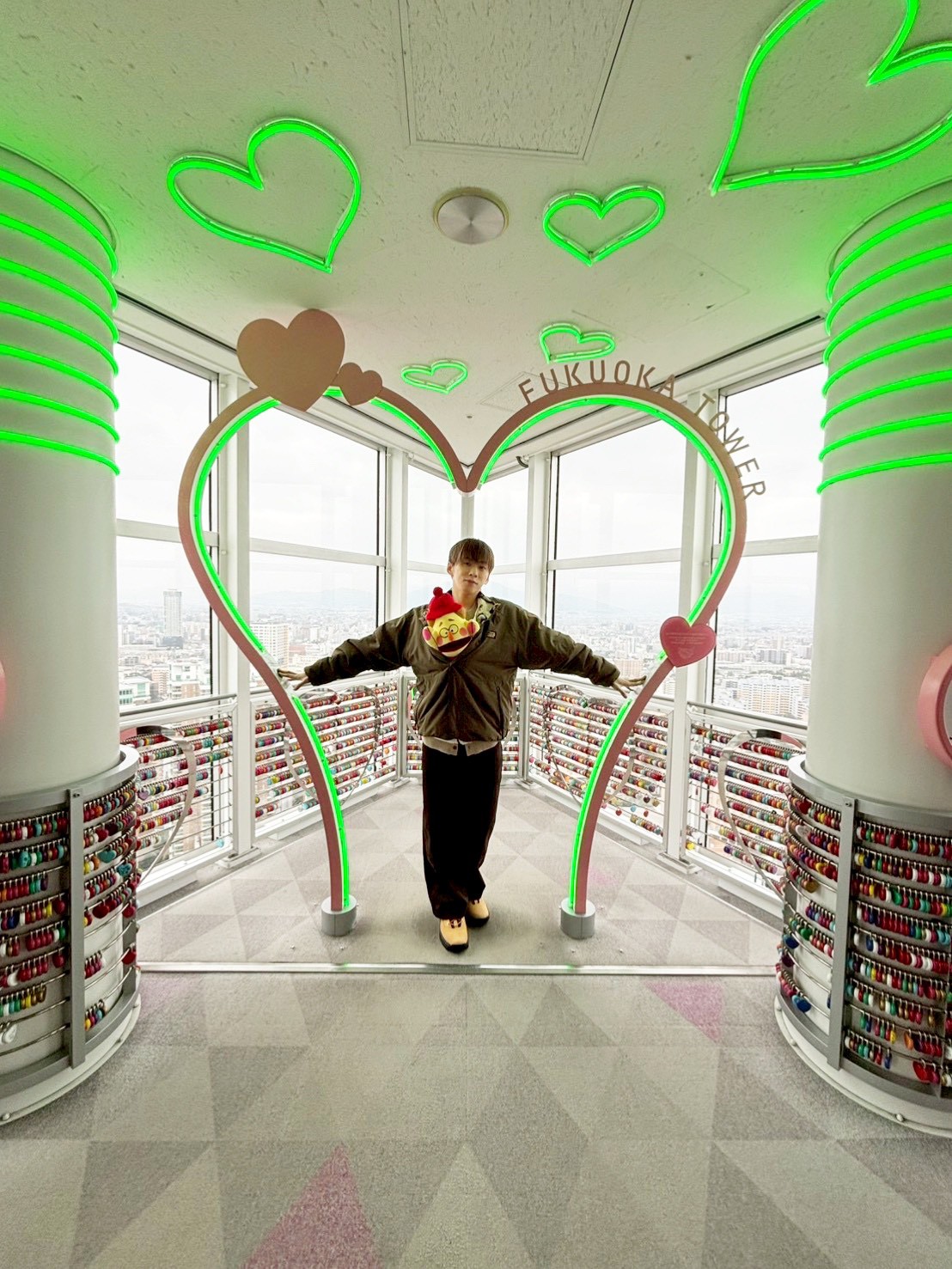 今回の旅は福岡タワー(福岡市西区)の展望室からスタート。「今まで来てませんでした」と、意外にも初めての訪問となった基だが、そこには「恋人の聖地」として知られ、最近では「推し活の聖地」としても注目されるハートのオブジェや誓いのフェンスが待ち構えていた。