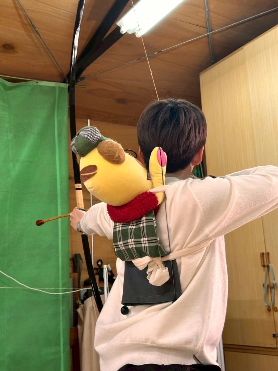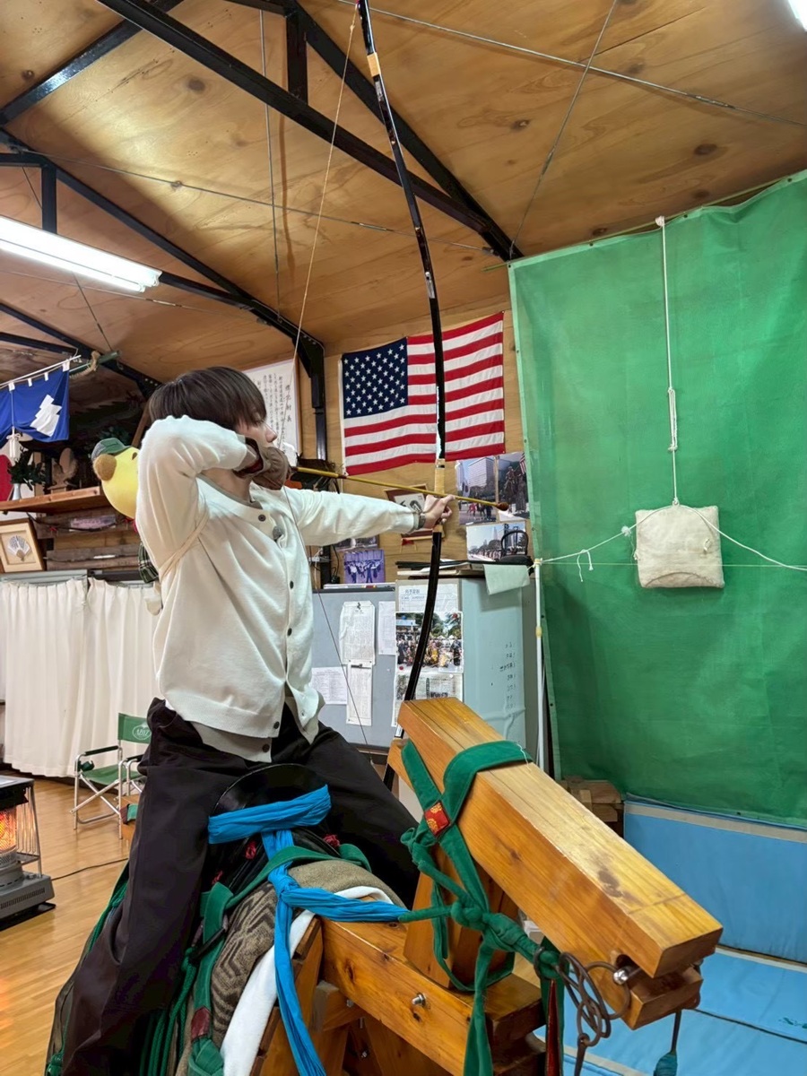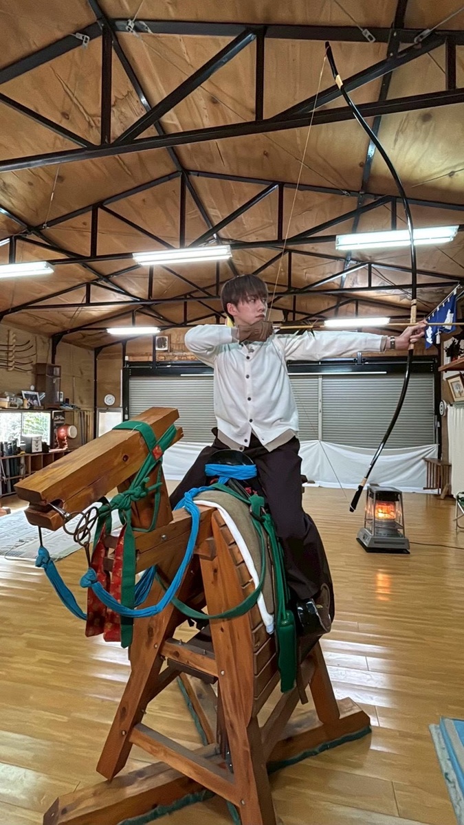 続いて、伝統行事「流鏑馬(やぶさめ)」に挑戦することに。木馬に乗ると「思ったより高い」と驚きつつも、放った矢が見事に的に的中すると「めっちゃ楽しいです」とご機嫌な様子。さらに木馬を激しく動かして「走る馬」を再現する難易度の高い状況では「無理ですよ、これ、本当に?」と大焦りしたものの、再び的中させると「いい狩りじゃった」とバッチリ決めてみせた。