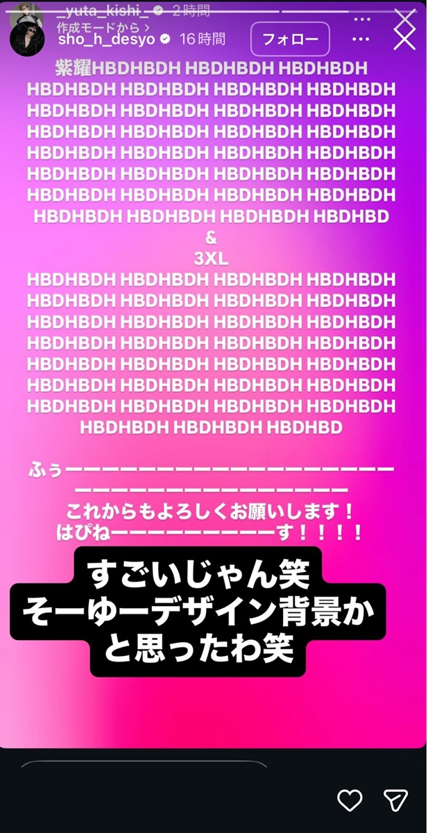 一方、岸はストーリーズに画面を埋め尽くさんばかりの大量の“HBD”の文字を並べた、インパクト抜群の画像を投稿。「これからもよろしくお願いします!はぴねーーーーーーーーーす!!!!」とハイテンションな言葉で祝った。