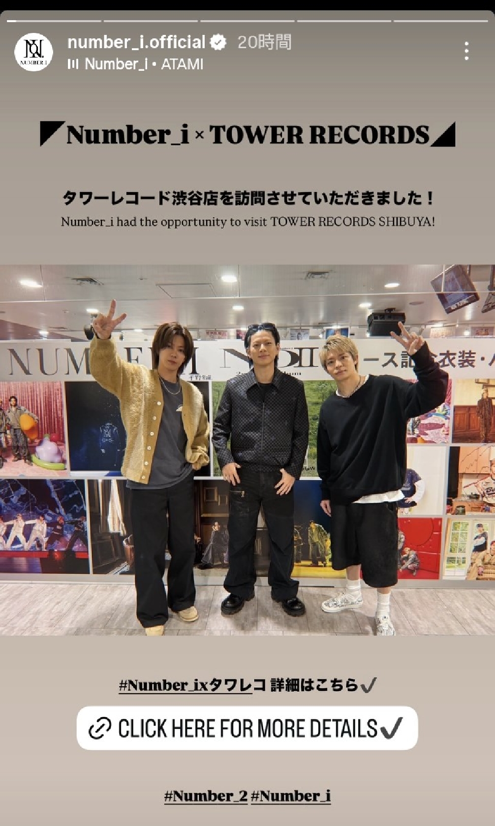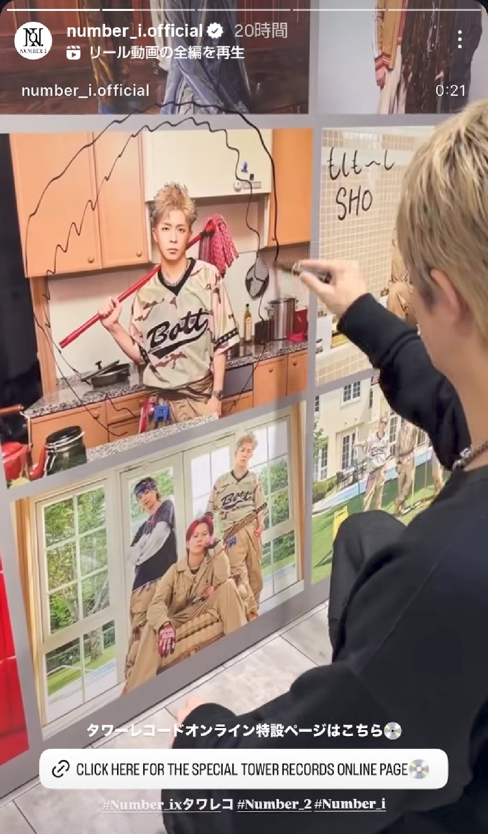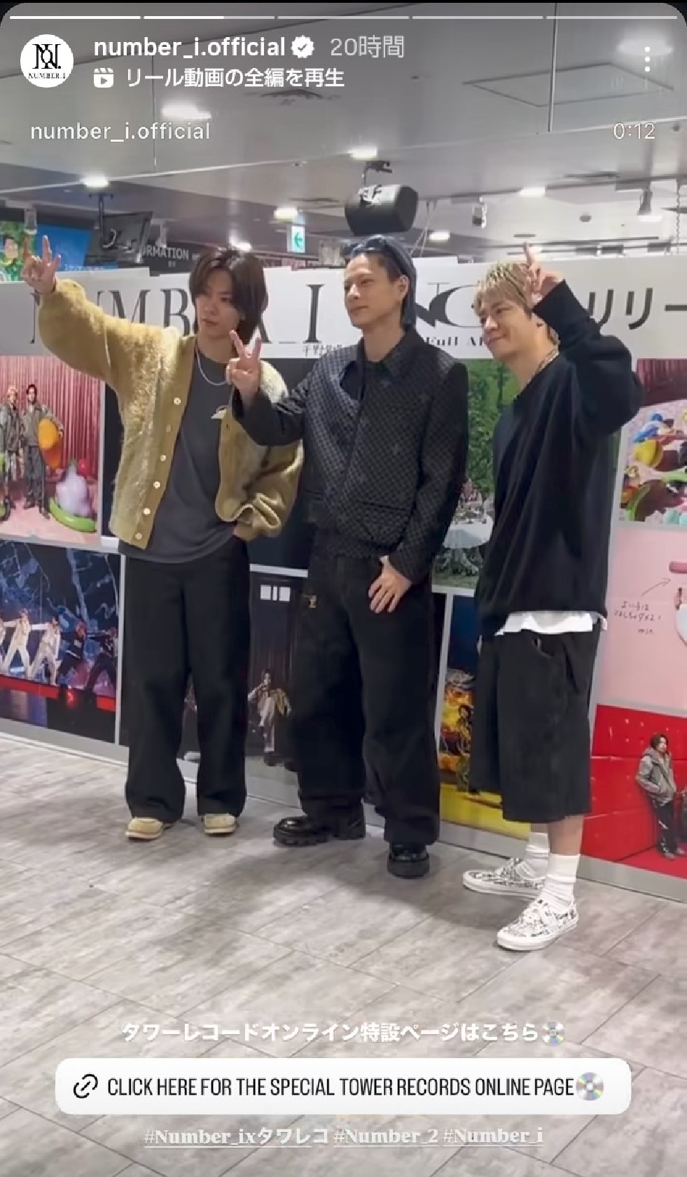 Number_iのメンバーやスタッフが6日、インスタグラムやストーリーズを更新。平野紫耀、神宮寺勇太、岸優太がタワーレコード渋谷店を訪問した際のオフショット写真とリール動画を公開した。