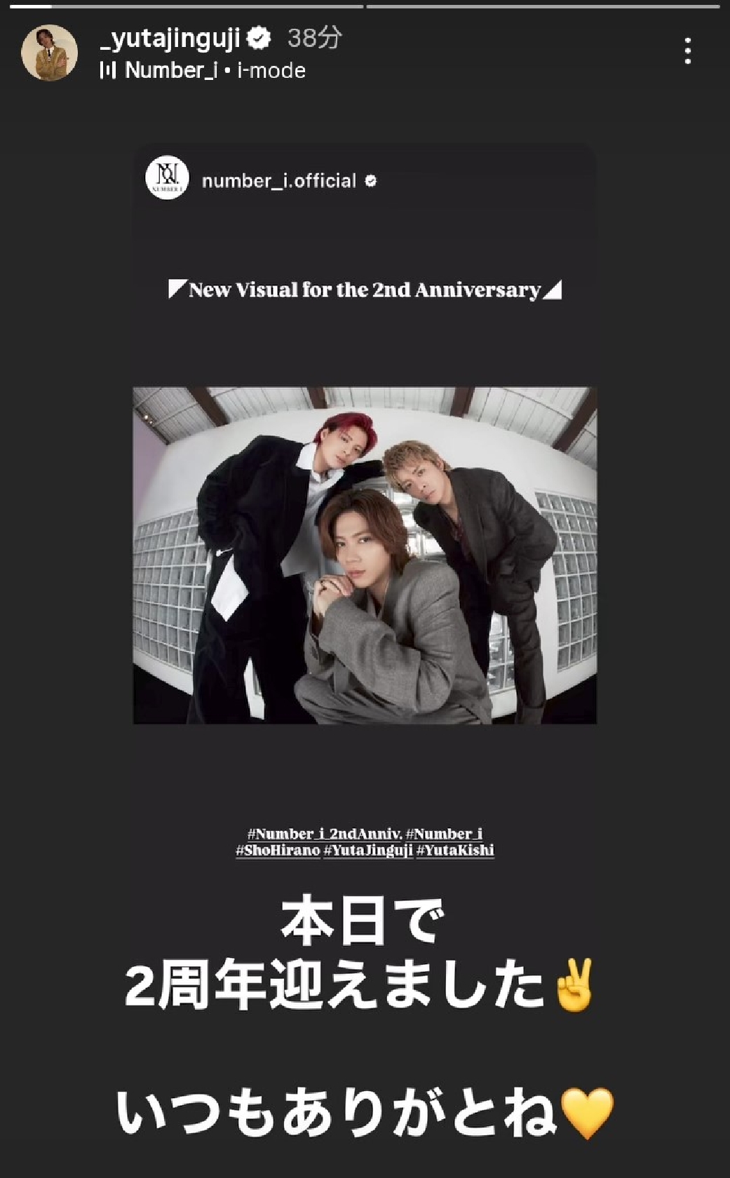 Number_iの神宮寺勇太が15日、インスタグラムのストーリーズを更新。グループ結成2周年を迎えた思いを自筆で記した。