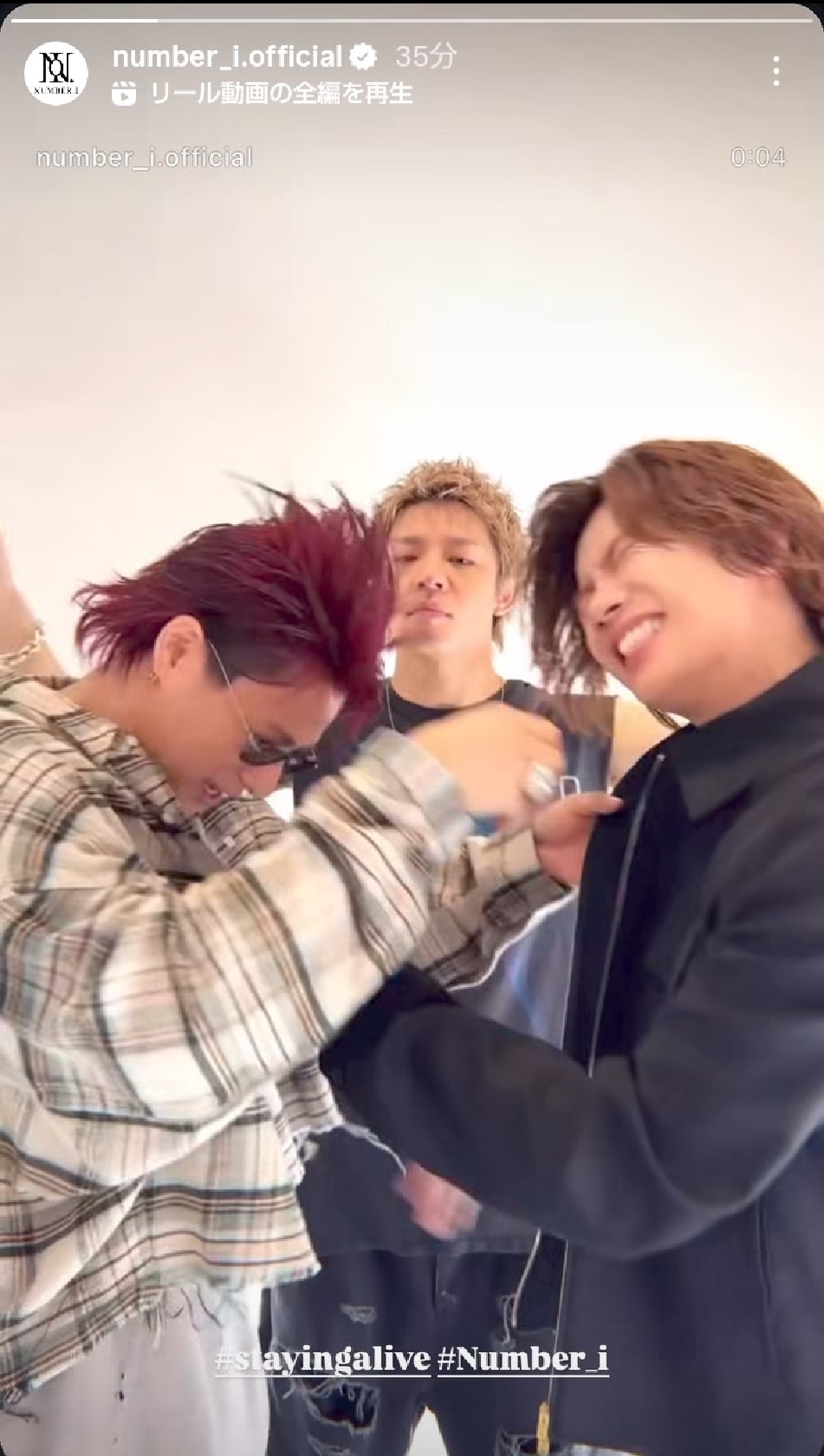Number_iのスタッフが20日、インスタグラムを更新。平野紫耀と神宮寺勇太が胸ぐらをつかみ合うリル動画を公開した。