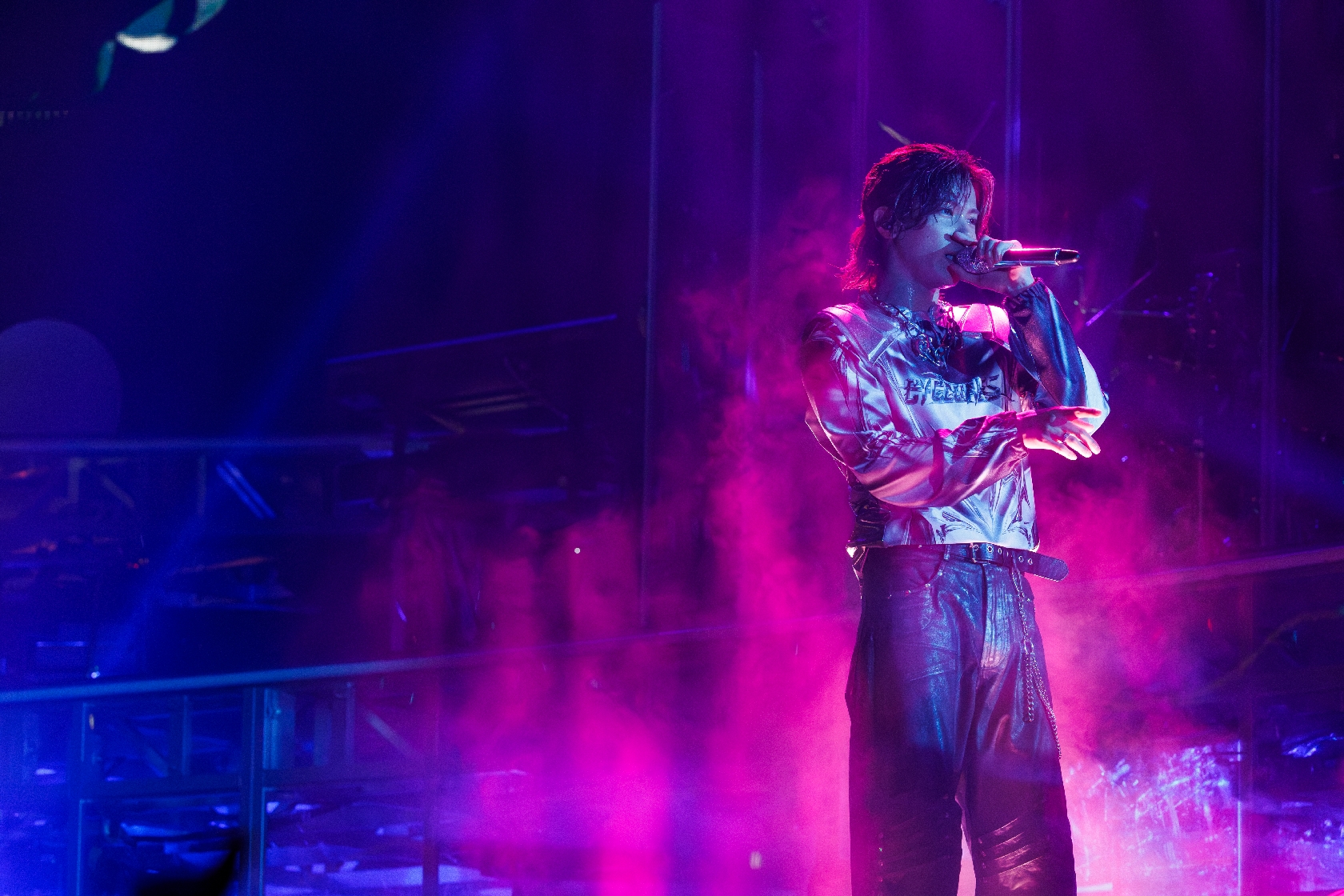 暗転と同時に、ツアーのために用意された世界観豊かなスペシャルムービーがスクリーンに映し出され、会場は映像に徐々に引き込まれていく。メンバーが突如として宇宙船に取り込まれる展開に驚きが走るのもつかの間、次の瞬間、実物のメンバーがゴンドラ上に現れ、現実世界と繋がる演出で登場。とてつもないライブのスタートを予感させる仕掛けと3人の姿に、会場の熱気は一気に高まった。