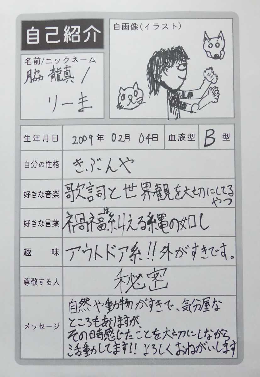 脇龍真の「自己紹介カード」。「僕の手の指、5本以上あるんです…。動物にかまれちゃったのかも」と苦笑いしていた