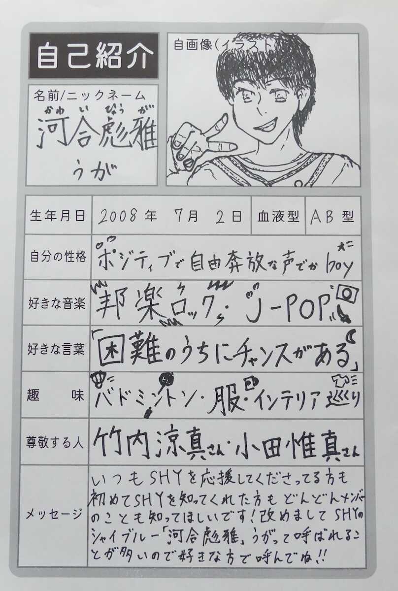 ◇SHY(シャイ)新井椋清、安部舜太、川原雅斗、生水稜也、仙波七星、松原有輝、峯大凱、脇龍真、河合の9人で2025年9月23日に結成。「ちょっぴりシャイだけど、一生懸命想いを届けます」というコンセプトを基に活動。「SHY」は、Spirit、Hope、Youthの頭文字を組み合わせたもの。1月17日に、東京・新宿ReNYで初のワンマンライブを行う。